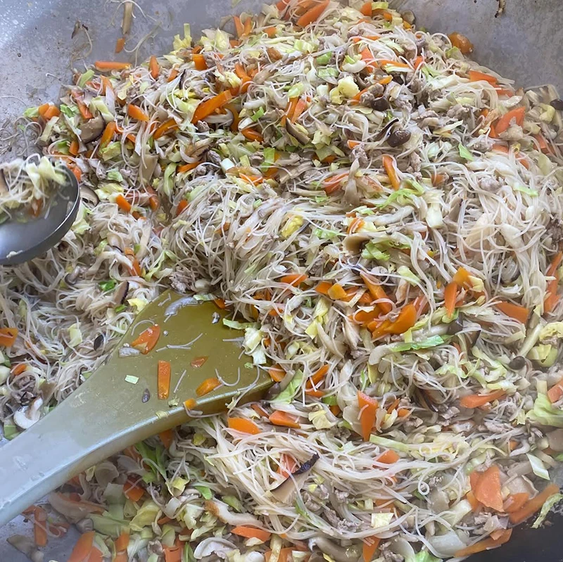 ビーフンの麺は、干し椎茸の戻し汁で戻して旨みを麺に閉じ込めるのがポイントです✨