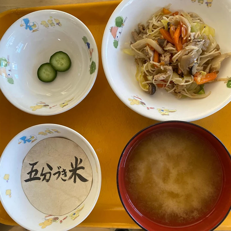 今日のお昼ごはんは、ビーフン、切り干し大根のみそ汁、きゅうりのぬか漬けでした。